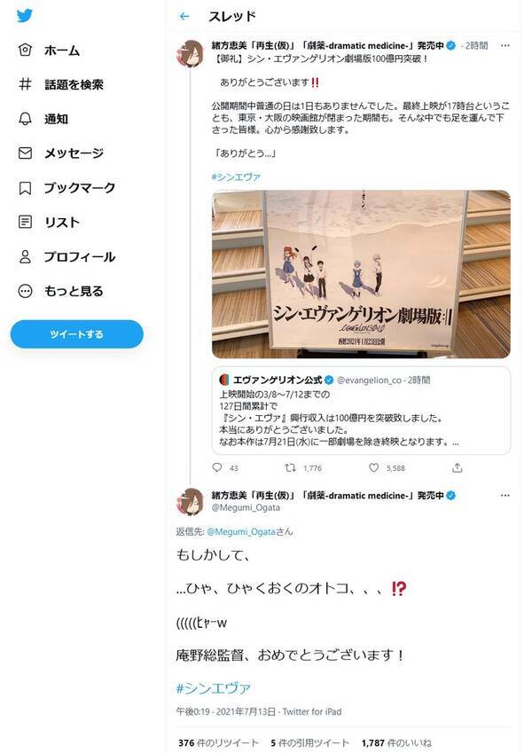 緒方恵美「再生(仮)」「劇薬-dramatic medicine-」発売中's tweet ... from www.trendsmap.com Jun 23, 2021 · 人気アニメ『新世紀エヴァンゲリオン』(以下、エヴァ)のオープニングテーマ「残酷な天使のテーゼ」などで知られる歌手・高橋洋子が23日. Jun 21, 2021 · ニュース 「シン・エヴァ オールナイトニッポン」今夜。緒方恵美ら16人出演 Jun 23, 2021 · 高橋洋子、エヴァ声優たちは「戦友」 『ann』緒方恵美&林原めぐみら"同窓会"に感慨 拡大写真 (左から)桜井博志旭酒造会長、高橋洋子 (c. いいかみんな! 仕事の集合時間は、うろ覚え&適当にじゃ、だめだぞっ⭐️きゅん⭐️ ↑ 1時間早く入ってしまった人 …控室でひとり孤独にipadで仕事して待つことにしました() …に、25時から、ニッポン放送「シン・エヴァンゲリオンのオールナイトニッポン」生放送‼️だ‼️よ ️ #シン. Jun 21, 2021 · 2021年6月21日25時よりニッポン放送ほか全国36局ネットで放送される『シン・エヴァンゲリオンのオールナイトニッポン』に緒方恵美、林原めぐみ.